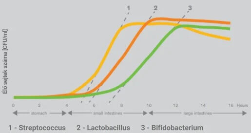 A törzseket úgy válogatták össze, hogy szinergikusan működjenek, egymást támogatva. Az alábbi grafikon az általunk alkalmazott baktériumok szaporodási görbéjét mutatja a beleinkben az idő tengelyén. Amikor az egyik baktériumtípus befejezi növekedési ciklusát, egy másik már készen áll a működésre. Egy adag (1 tabletta) több órán át hat.