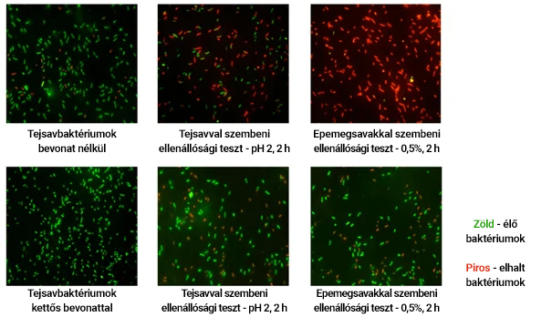 A kettős bevonatú baktériumok túlélését alaposan megvizsgálták. Alább mikroszkópos megfigyelések láthatók, amelyek bemutatják a bevont tejsavbaktériumok ellenállását azokkal a körülményekkel szemben, amelyek az emésztőrendszeren való áthaladás során várnak rájuk.