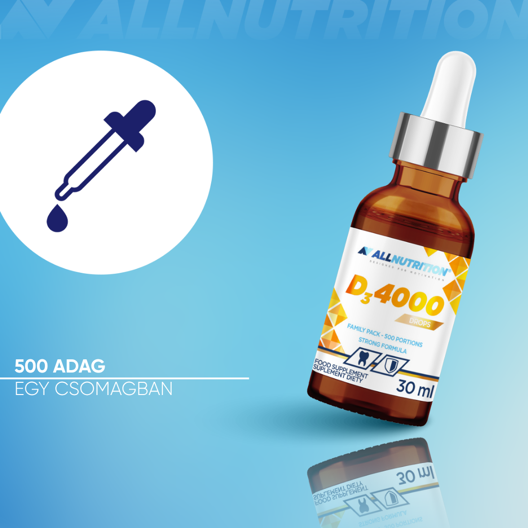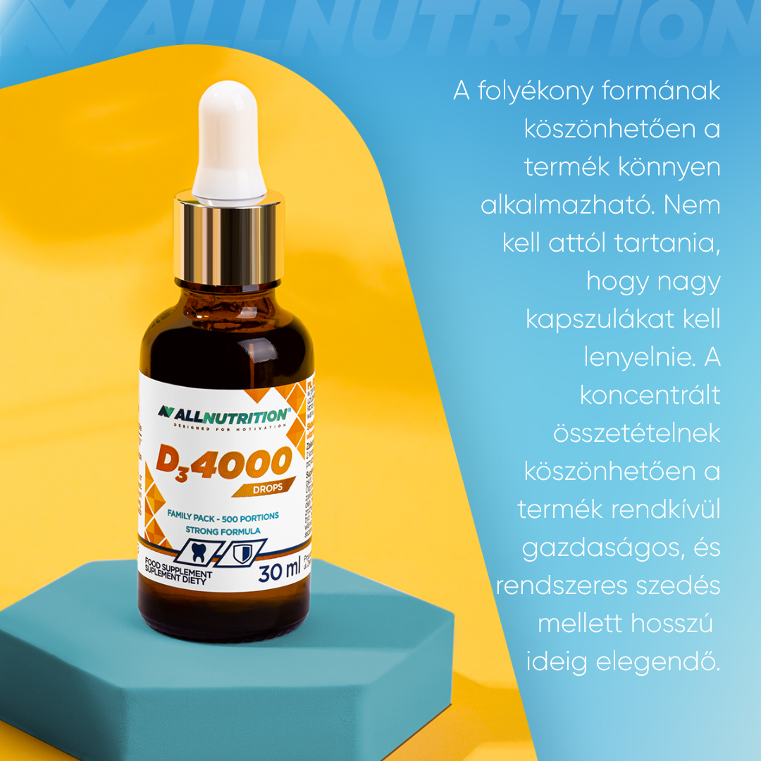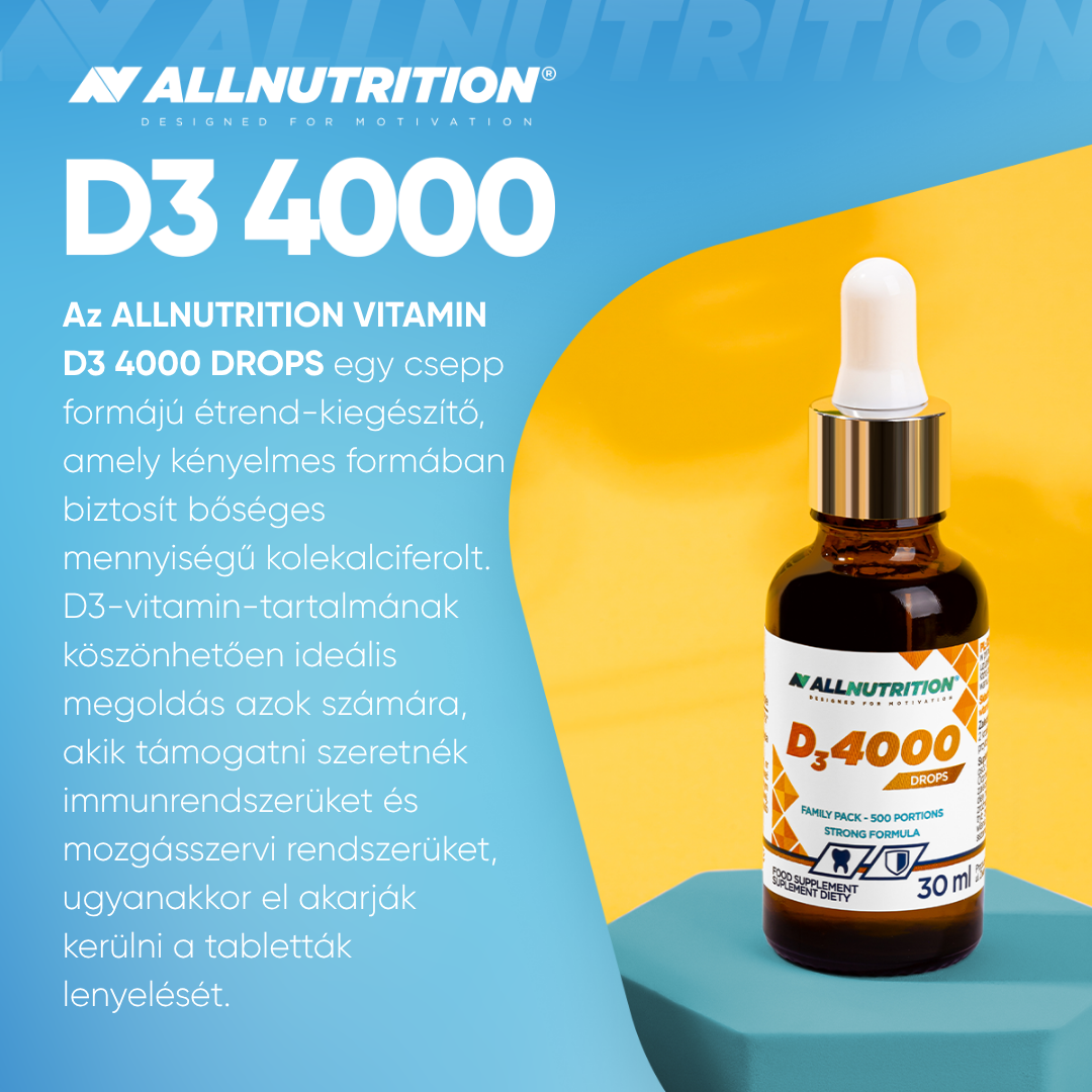 ALLNUTRITION D3-VITAMIN 4000 DROPS csepp formájú étrend-kiegészítő, amely jelentős mennyiségű kolekalciferolt biztosít kényelmes formában. Ideális választás azok számára, akik szeretnék támogatni immunrendszerüket és mozgásszervi rendszerüket a D3-vitamin tartalmának köszönhetően, miközben elkerülik a tabletták lenyelését. Egy csomag akár 500 adag támogatást biztosít a szervezet számára!