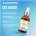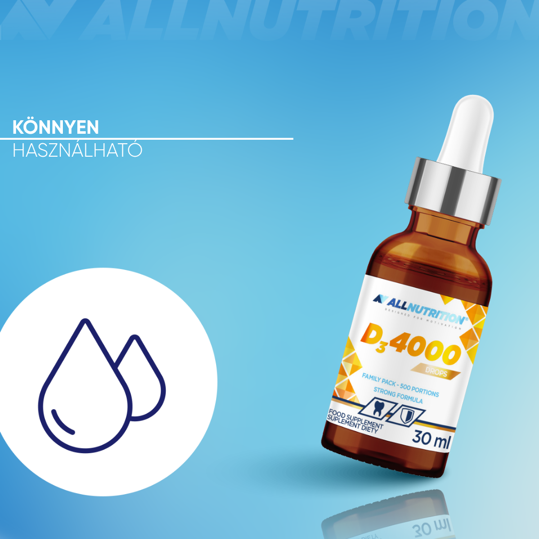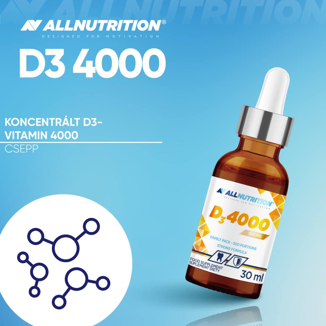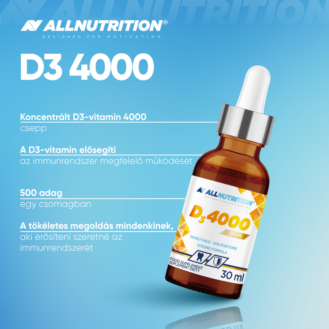 ALLNUTRITION D3-VITAMIN 4000 DROPS csepp formájú étrend-kiegészítő, amely jelentős mennyiségű kolekalciferolt biztosít kényelmes formában. Ideális választás azok számára, akik szeretnék támogatni immunrendszerüket és mozgásszervi rendszerüket a D3-vitamin tartalmának köszönhetően, miközben elkerülik a tabletták lenyelését. Egy csomag akár 500 adag támogatást biztosít a szervezet számára!