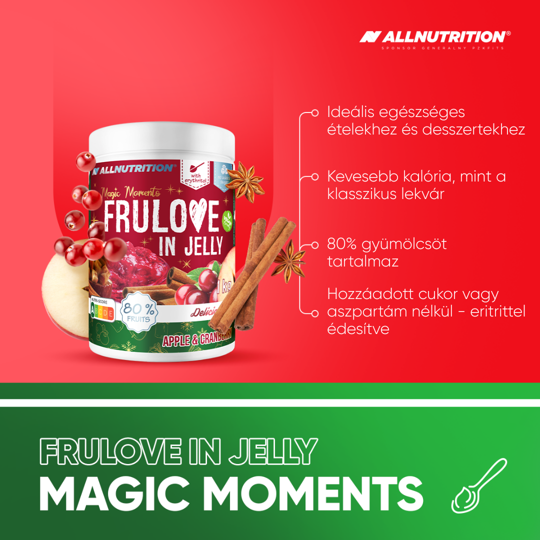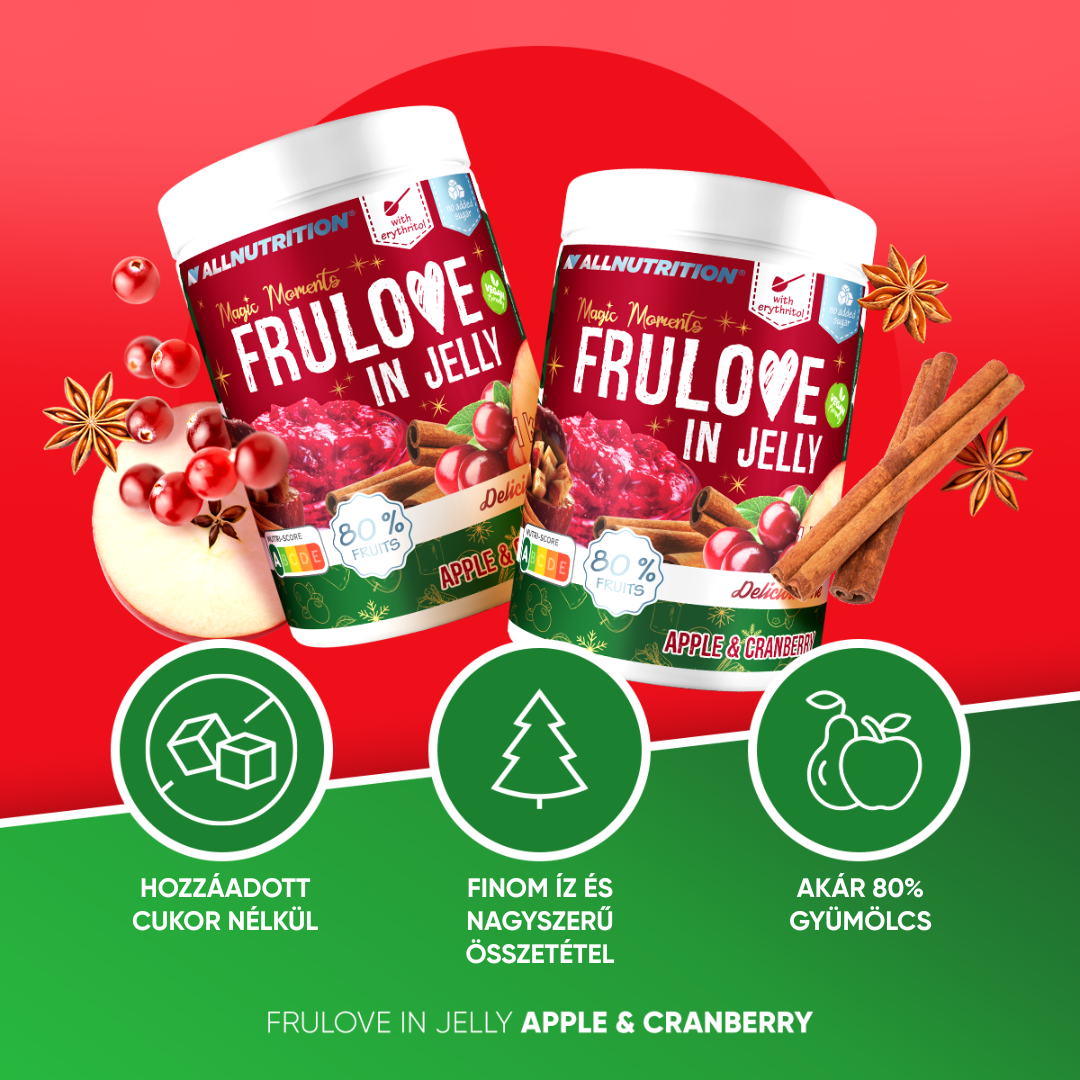 ALLNUTRITION FRULOVE IN JELLY APPLE & CRANBERRY egy ízletes lekvár limitált, karácsonyi Magic Moments kiadásunkból! Különleges kombinációja az almakockáknak és a vörösáfonyának, fahéjjal gazdagítva, könnyű zselébe zárva – természetesen hozzáadott cukor nélkül.
