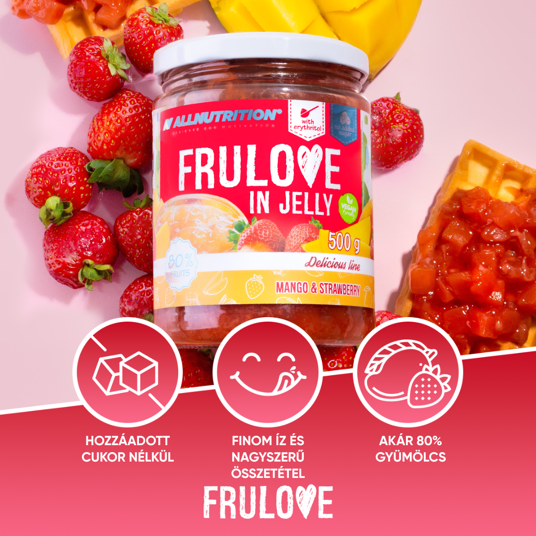 ALLNUTRITION FRULOVE IN JELLY MANGO & STRAWBERRY egy mennyei dzsem, hozzáadott cukor nélkül, valódi mangó- és eperdarabokkal – a termék akár 80%-a gyümölcs! Azok számára készült, akik figyelnek az alakjukra, de nem szeretnének lemondani a kis édes örömökről.