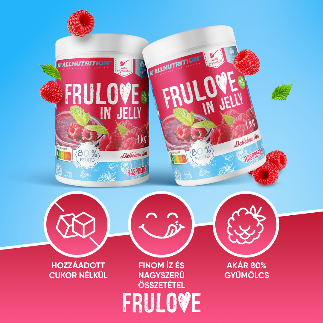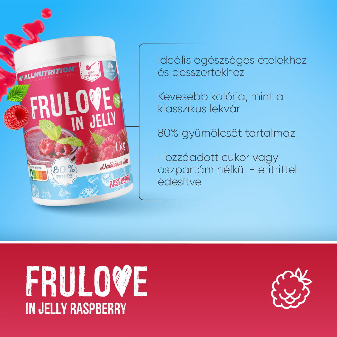 ALLNUTRITION FRULOVE IN JELLY RASPBERRY ez egy finom, cukormentes lekvár, egész málnadarabokkal, 80% gyümölcstartalommal! Azok számára készült, akik szeretnének formában maradni, de nem akarnak lemondani a diétájukból egy kis édes élvezetről sem.