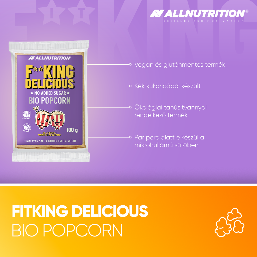ALLNUTRITION FITKING DELICIOUS BIO POPCORN tökéletes sós snack mindenkinek, aki alternatívát keres a hagyományos popcornra. Ökológiai gazdálkodásból származó kék kukoricából készült, hozzáadott cukor nélkül – csak természetesen előforduló cukrokat tartalmaz. Pálmaolaj helyett sheavajat használtunk! Gyors és egyszerű módja annak, hogy finom popcornt készítsen, amely ideális filmnézéshez. Magas rosttartalom, vegán formula és egyszerű összetevők – pontosan erre van szüksége!