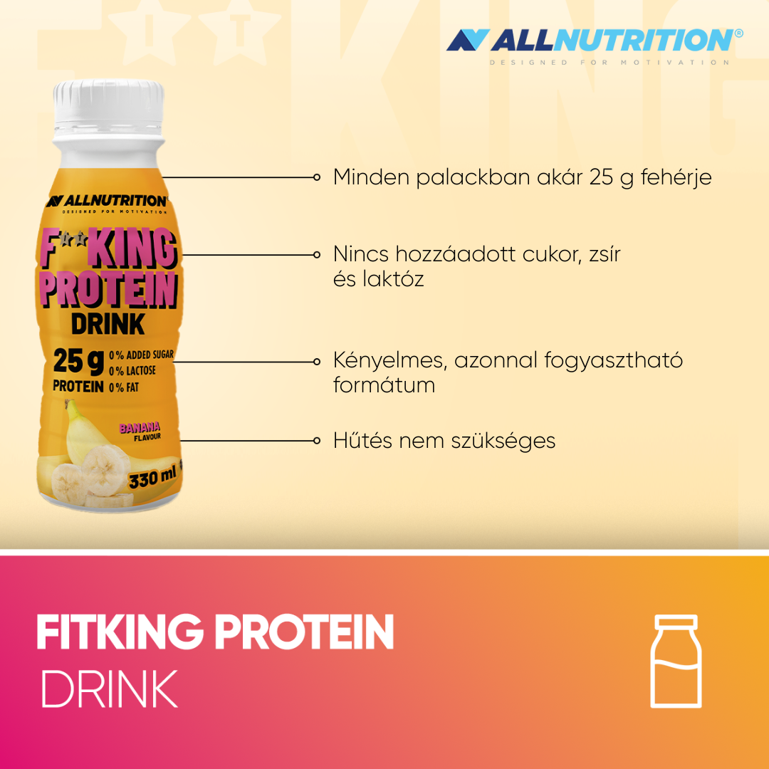 ALLNUTRITION FITKING PROTEIN DRINK egy finom, magas fehérjetartalmú tejital, amely két különleges ízben – vaníliás és banános – érhető el. Minden palack akár 25 g fehérjét tartalmaz, miközben nem tartalmaz hozzáadott cukrot, laktózt vagy zsírt. Kényelmes megoldás mindenkinek, aki értékes tápanyagokkal szeretné kiegészíteni étrendjét – bármilyen elfoglalt nap során. Tökéletes választás munkában, útközben, edzés után, vagy amikor gyors és tápláló italra van szükséged.