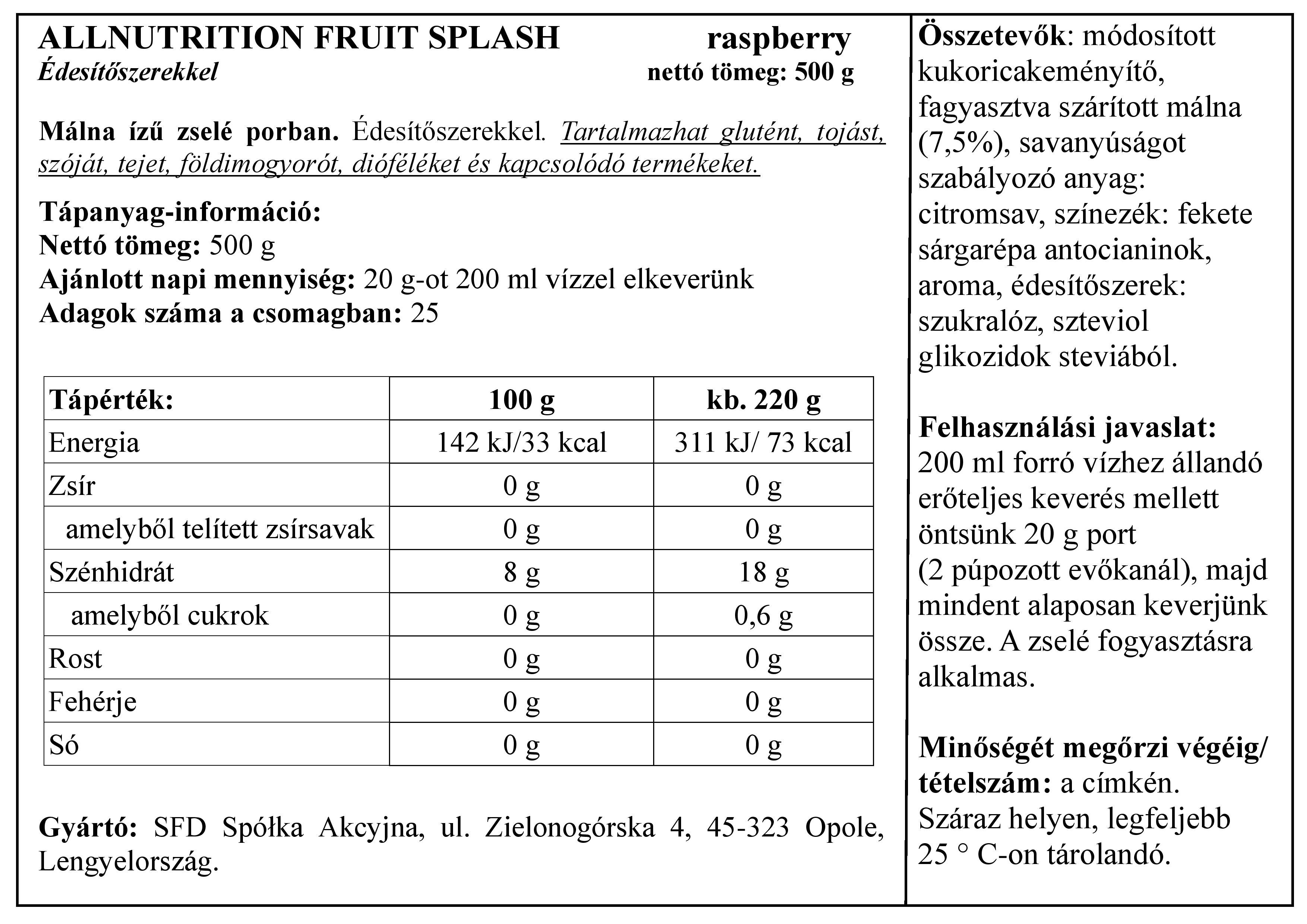 Használat módja Elkészítési mód: Folyamatos, energikus kevergetés mellett szórj bele 20 g (2 púpos evőkanál) port 200 ml forró vízbe, és alaposan keverd el! Kész is a gyümölcszselé. Száraz helyen, max. 25 °C hőmérsékleten tárolandó. Glutént, tojást, szóját, tejet, földimogyorót, dióféléket és ezekből származó termékeket tartalmazhat. A tápértékekben íztől függően jelentéktelen mértékű eltérések lehetnek.