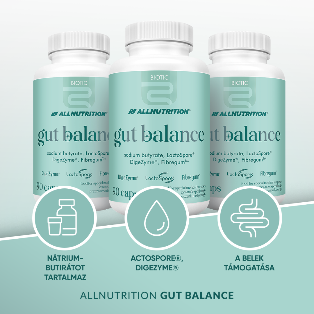 ALLNUTRITION GUT BALANCE orvosi célra szánt különleges tápszer* kapszula formájában, amely többek között a vajsav forrása — a bélhám alapvető energiaforrása.