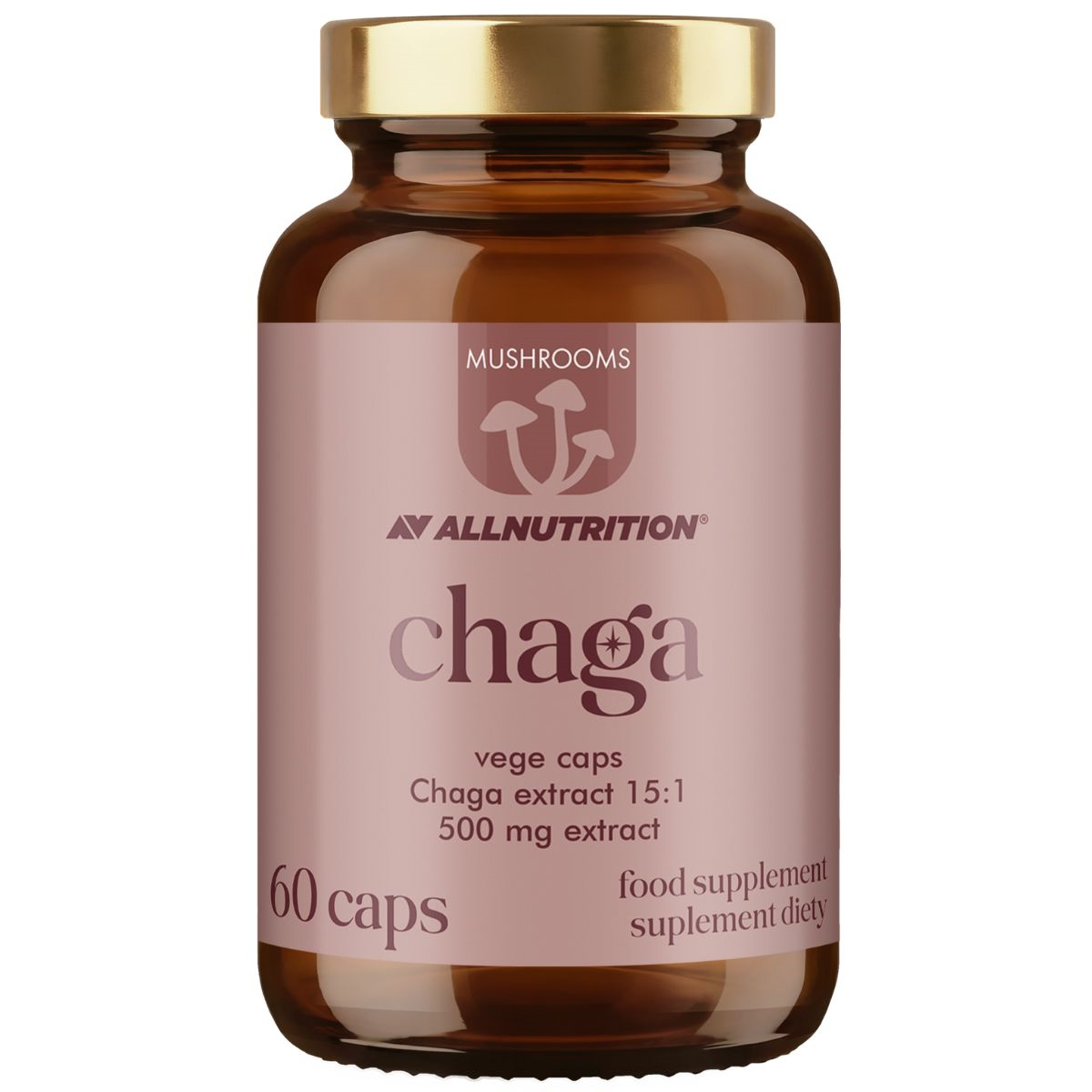 ALLNUTRITION MUSHROOMS CHAGA étrend-kiegészítő vegán kapszula formájában, amely ferde likacsosgomba (Inonotus obliquus) termőtest kivonatot biztosít. A termék a speciális MUSHROOMS termékcsaládhoz tartozik, és azok számára készült, akik természetes kivonatok formájában keresnek támogatást. Egy csomag akár két hónap rendszeres kiegészítésre elegendő.