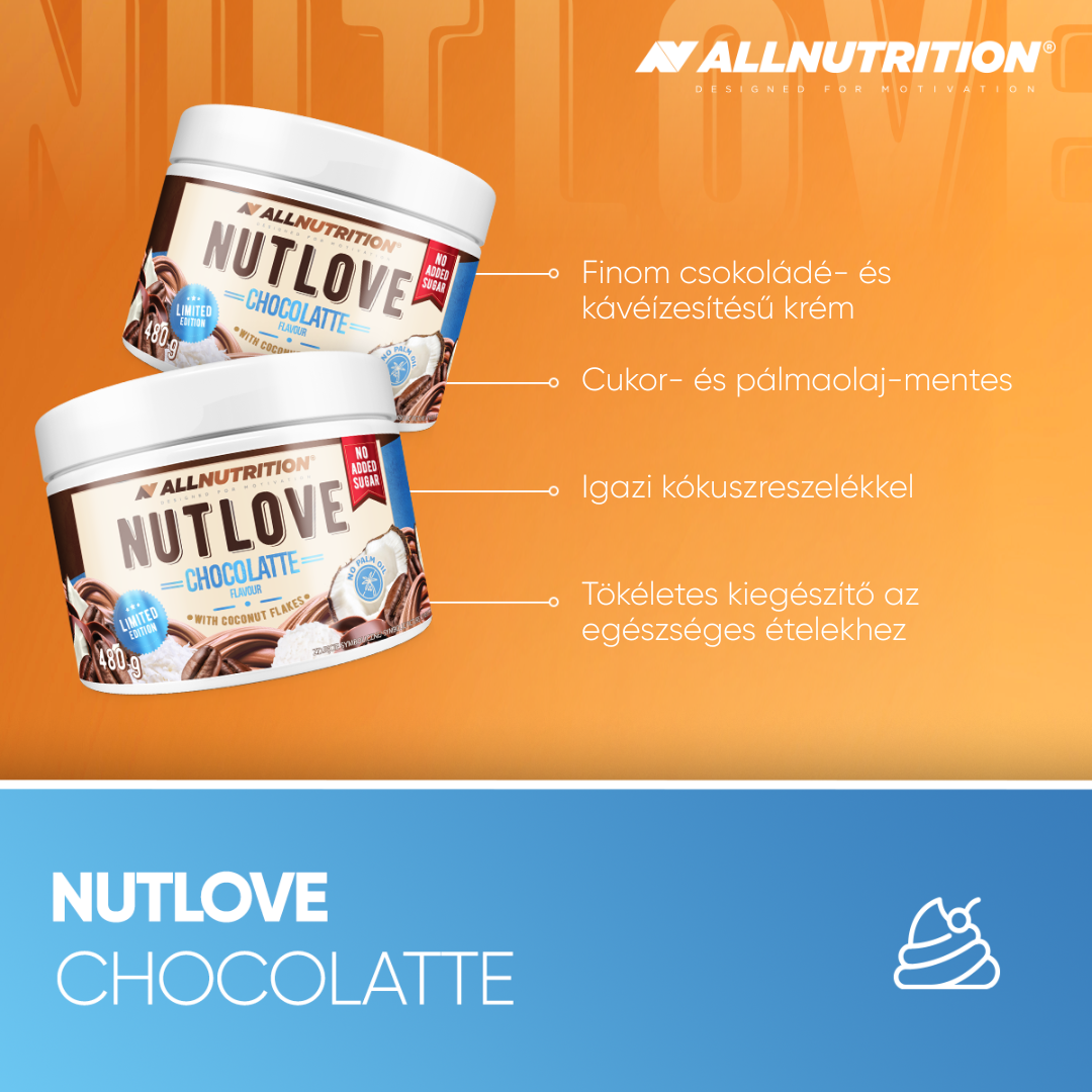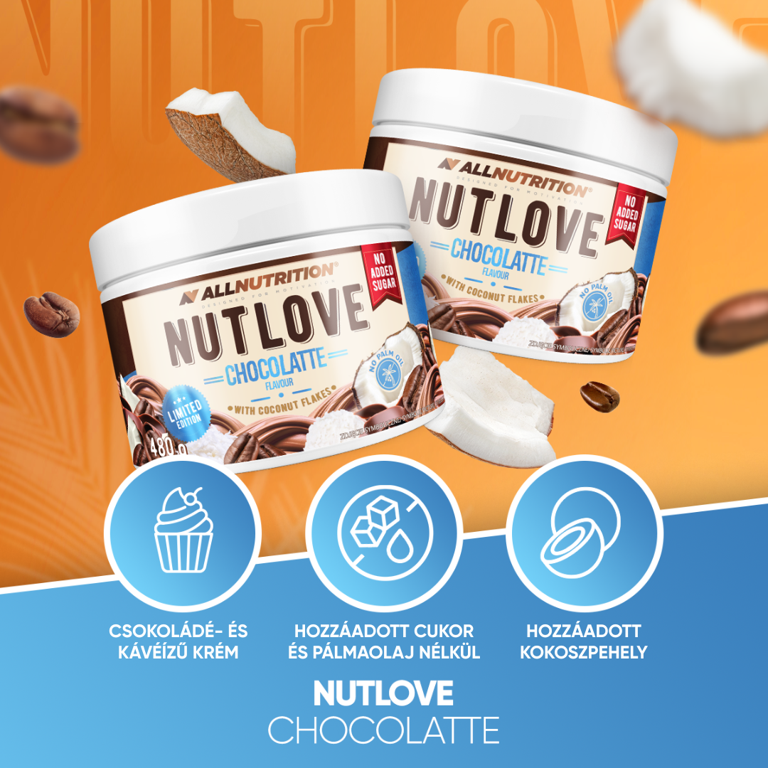 Fedezd fel a ALLNUTRITION NUTLOVE CHOCOLATTE-ot! Egy ellenállhatatlanul finom kávés-csokoládés krém valódi kókuszreszelékkel. Ez a legújabb, limitált kiadású verzió a kedvenc krémedből, amely garantáltan meglep és tökéletesen illik a fit receptjeidhez!