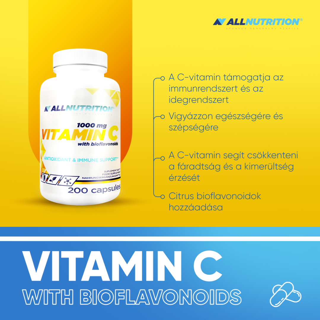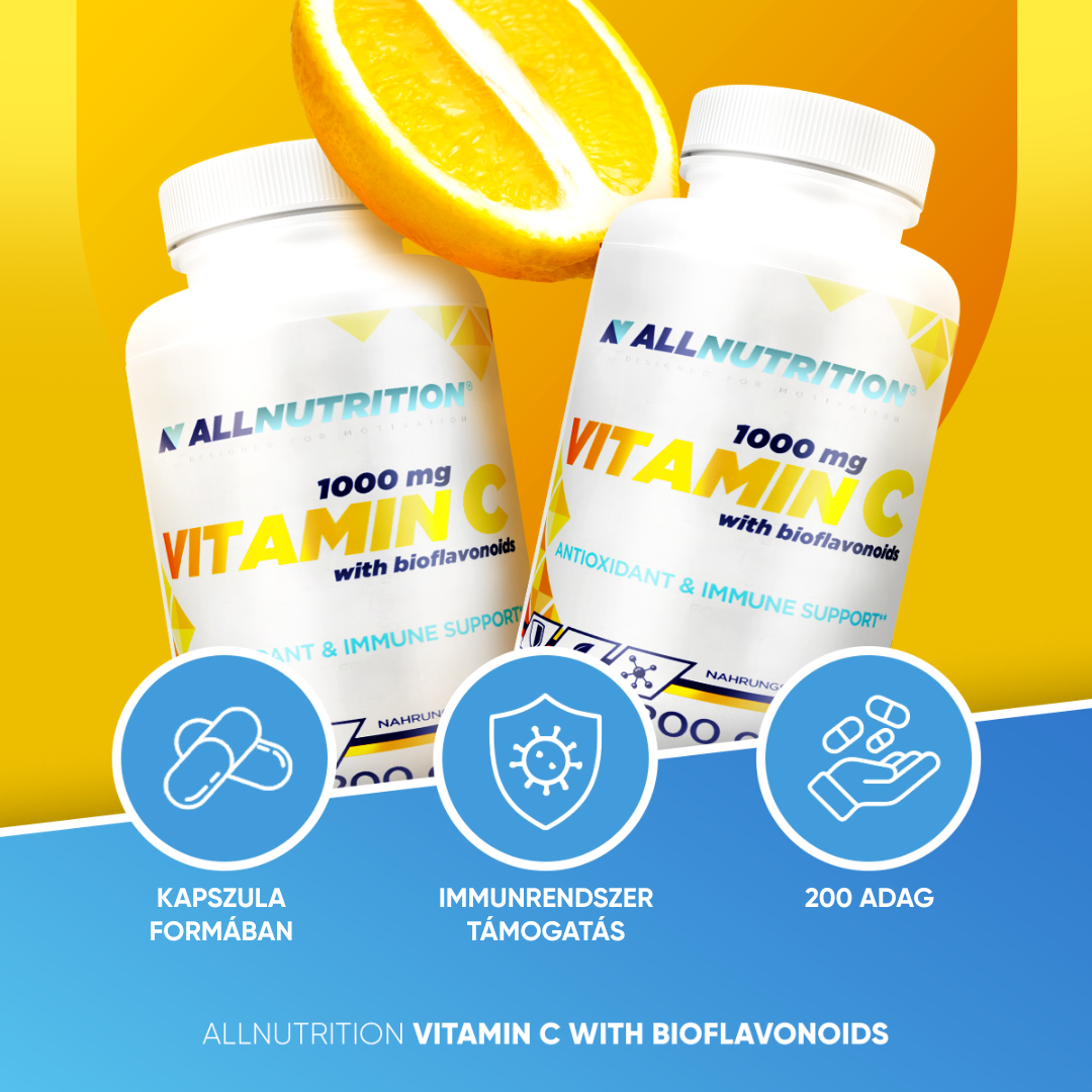 A ALLNUTRITION VITAMIN C WITH BIOFLAVONOIDS C-vitaminhiány pótlására és az immunrendszer működésének serkentésére összeállított termék. Mivel két erős antioxidánsban, C-vitaminban és bioflavonoidokban, gazdag, hozzájárul szervezetünk sejtjeinek oxidatív stresszel szembeni védelméhez.