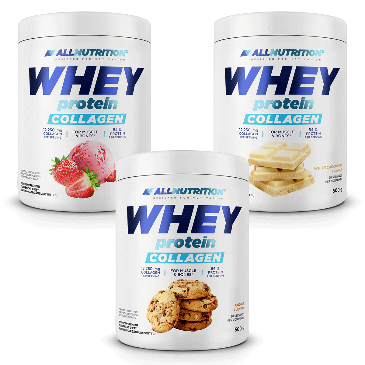ALLNUTRITION WHEY PROTEIN COLLAGEN egy bestseller WPC tejsavófehérje új kiadásban – marhakollagén peptidekkel dúsítva. Nemcsak a nagyobb, erősebb izmok építését támogatja, hanem a szervezet komplex regenerációját és az egészséges csontokat is.