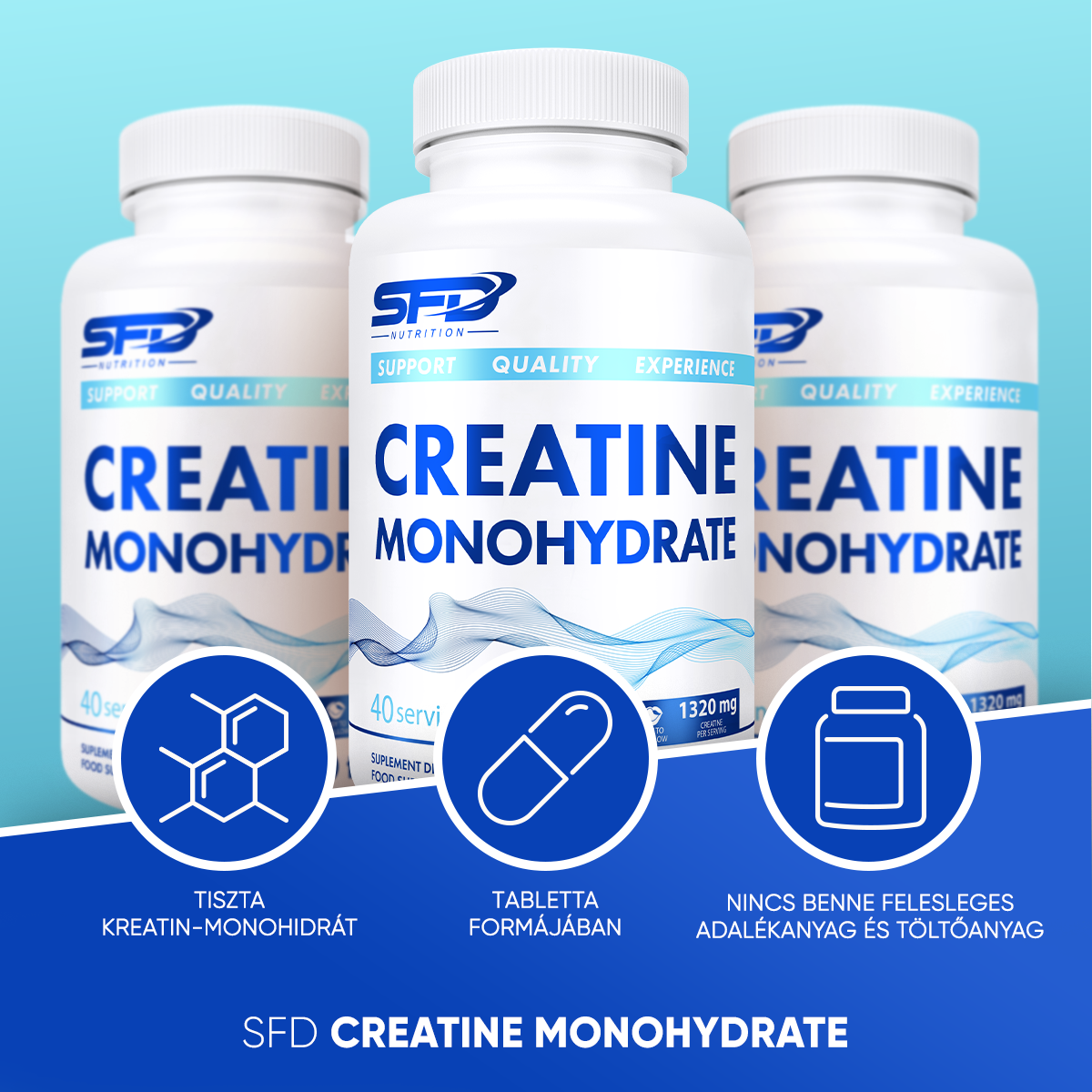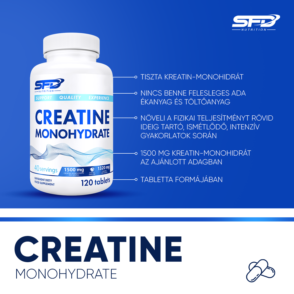 Az SFD CREATINE MONOHYDRATE tiszta kreatin-monohidrátot tartalmaz tabletta formában. Nincs benne felesleges adalékanyag és töltőanyag. A termék fizikailag aktív személyeknek készült. A termék 40 adagot biztosít.