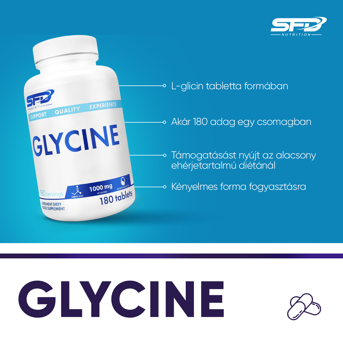 glicin, töltőanyag: mikrokristályos cellulóz, keményítő, csomósodást gátló szerek: szilícium-dioxid, zsírsavak magnézium sói