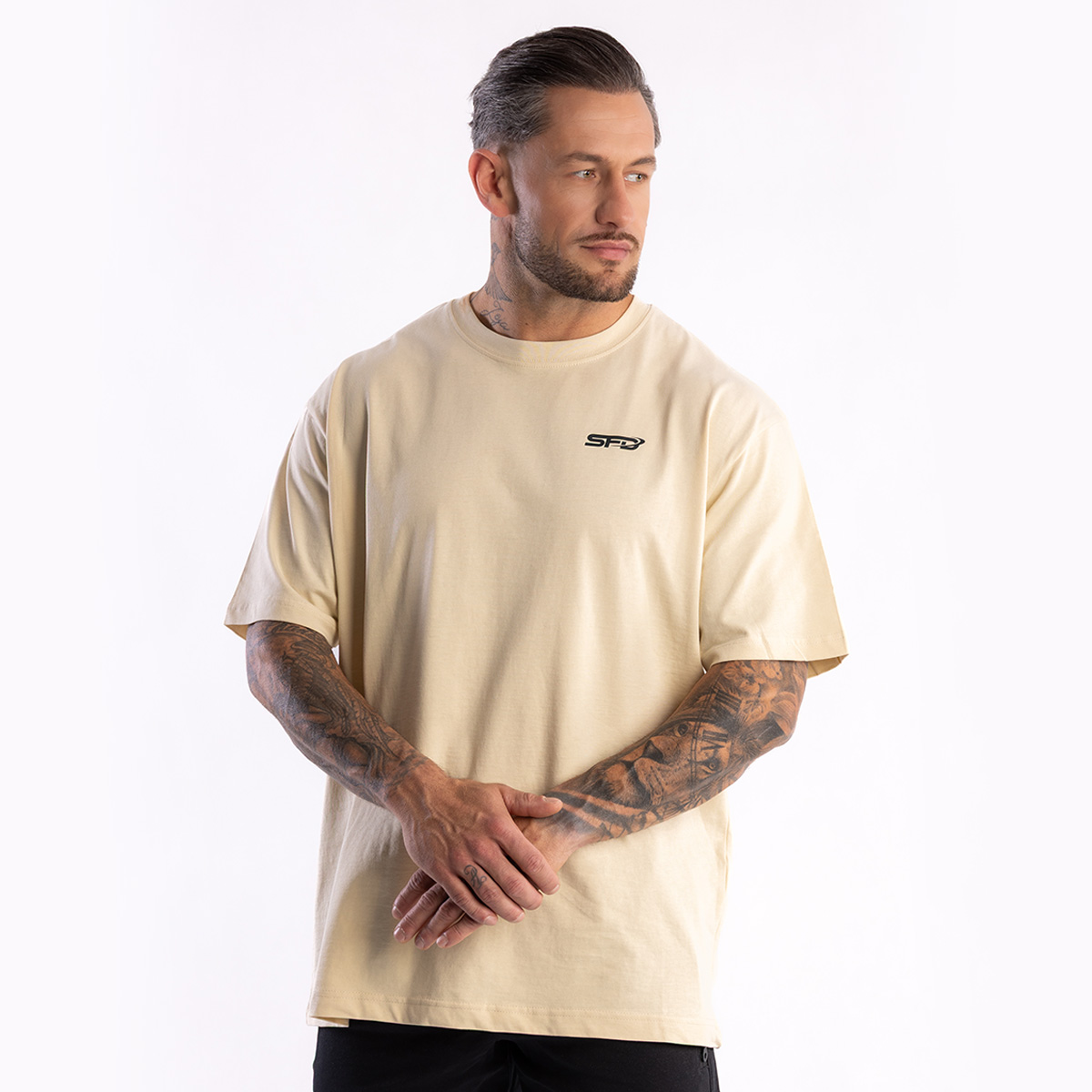 SFD T-SHIRT CORE OVERSIZE CREAM nem csupán egy egyszerű póló, hanem a stílusod igazi kifejezője, amely tökéletesen illeszkedik a fizikai aktivitás és a sportos szellem világába.